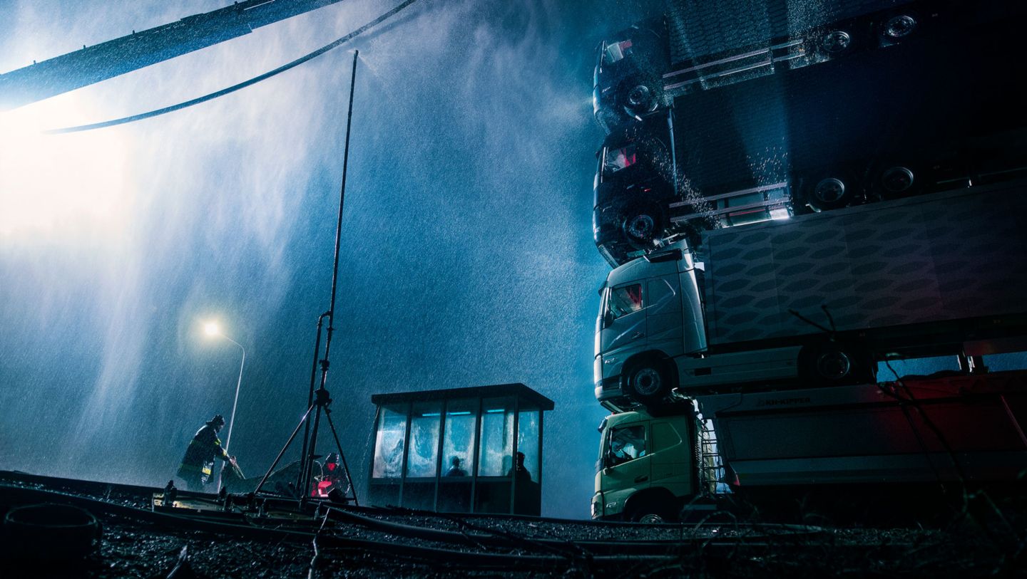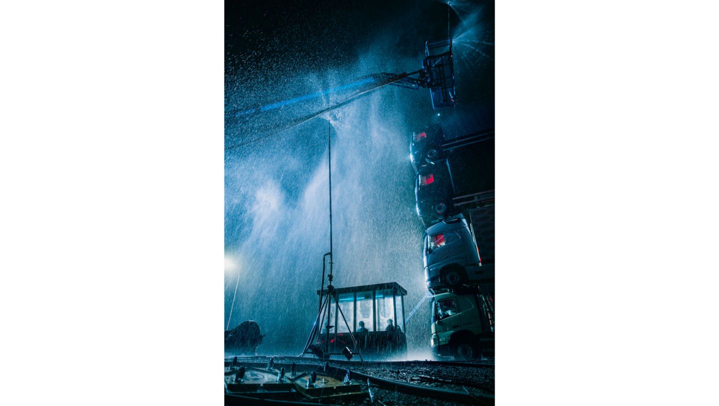 The film was shot in late 2019 on a testing ground outside Volvo’s hometown of Gothenburg, Sweden. Both the truck tower and the majority of the visual effects are real, including the smoke and lights, which a behind-the-scenes film reveals.